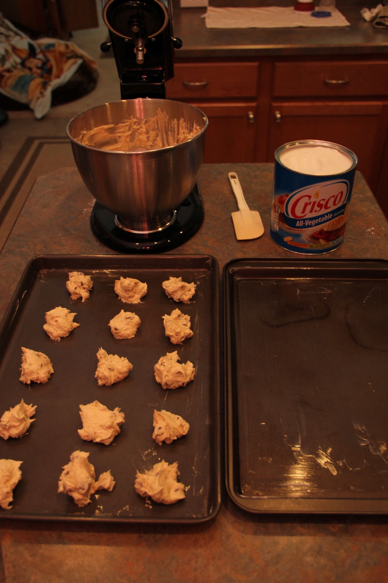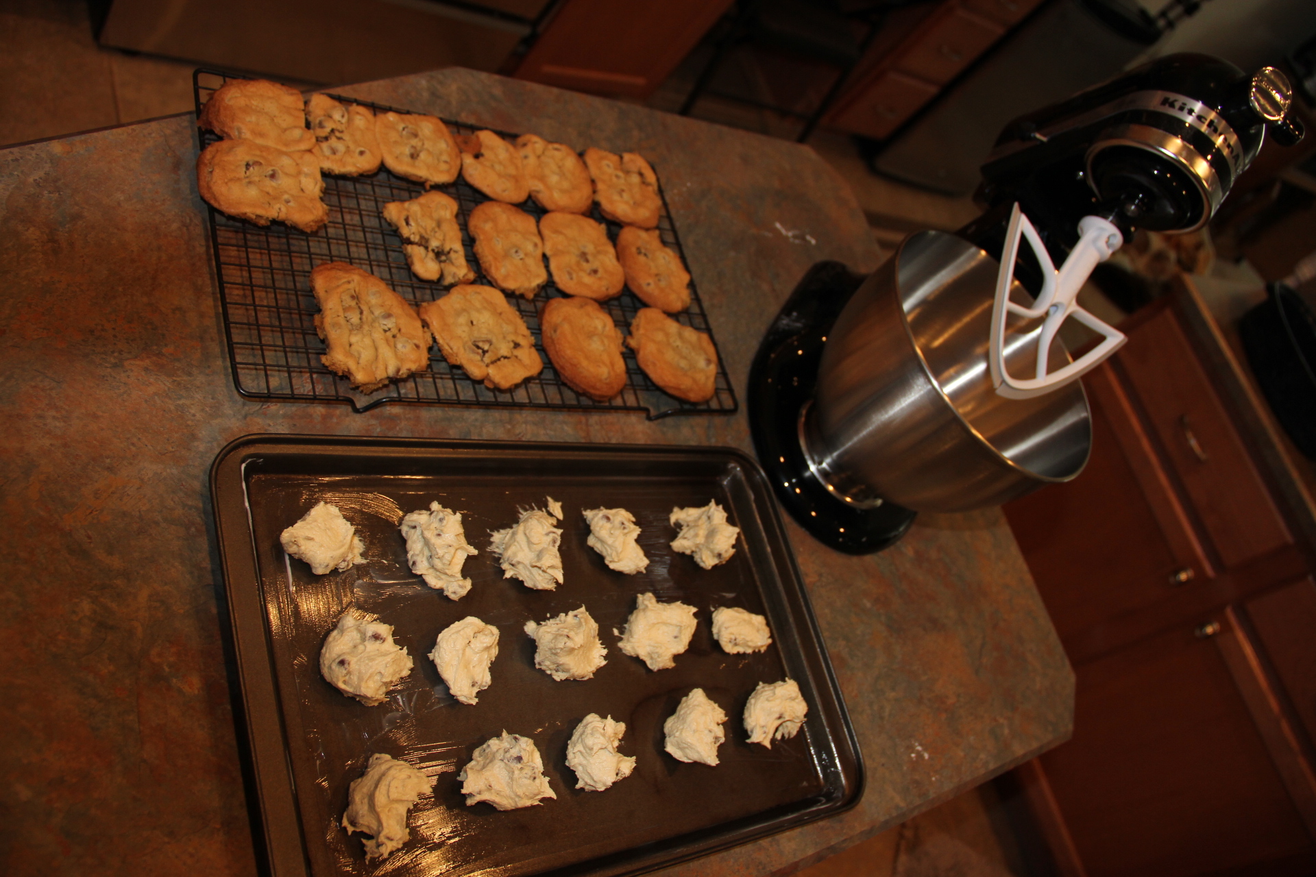 I decided to crack open the chocolate chip cookie recipe today. I used some of my advice on how to smooth out the flow of getting things into the mixing bowl, onto the cookie sheet, out of the oven and onto the cooling rack.
