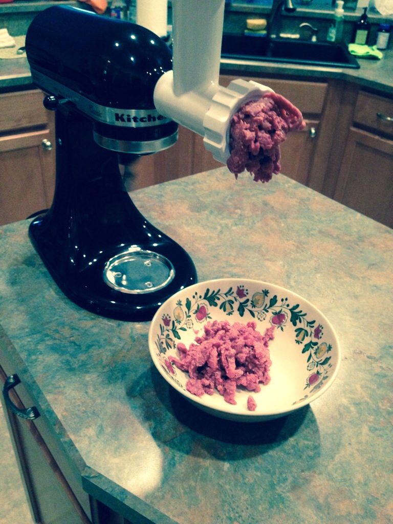 The Metro Beater Blade works awesome on this stuff as well, didn’t need a spatula and clean-up was a breeze. The meat grinding attachment doesn’t do well with fat, so trim off as much as you can before you grind it into ground beef. Your mixer will have a much easier time and you won’t waste 15 minutes trying to clean out the die before you can even wash it. The mixer still did an outstanding job.